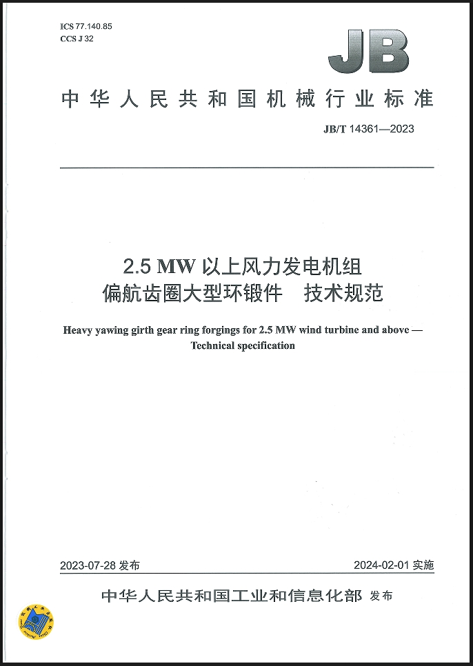 中環海陸聯合大連聯合風電軸承有限公司、江蘇大學、武漢理工大學,共同制定《2.5MW以上風力發電機組偏航齒圈大型環鍛件 技術規范》。中環海陸作為標準第一起草單位,在所有測試項目的測試方法上都進行了深入的研究,該標準于2024年2月1日實施。本標準解決了2.5MW以上風力發電機組偏航齒圈大型環鍛件的選材問題,確定了2.5MW以上風力發電機組偏航齒圈大型環鍛件的常用材料、技術指標、檢測方法和檢驗規則,填補了相關標準的空白。